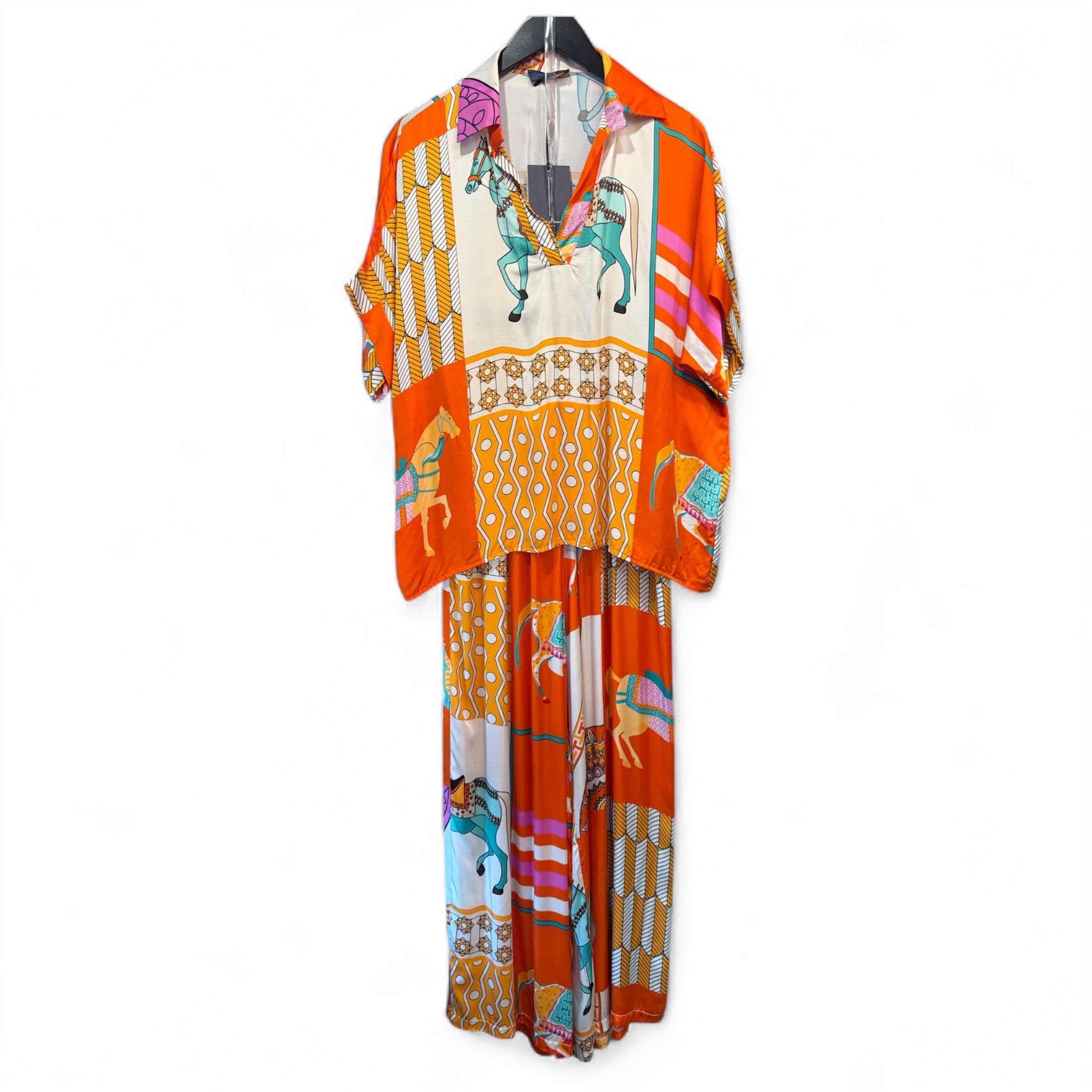 Stunning tunic and wide-leg trouser set with gorgeous ‘Hermes’ style horse print. Perfect as a two piece, or layered with knitwear. In gorgeous satin fabric.
