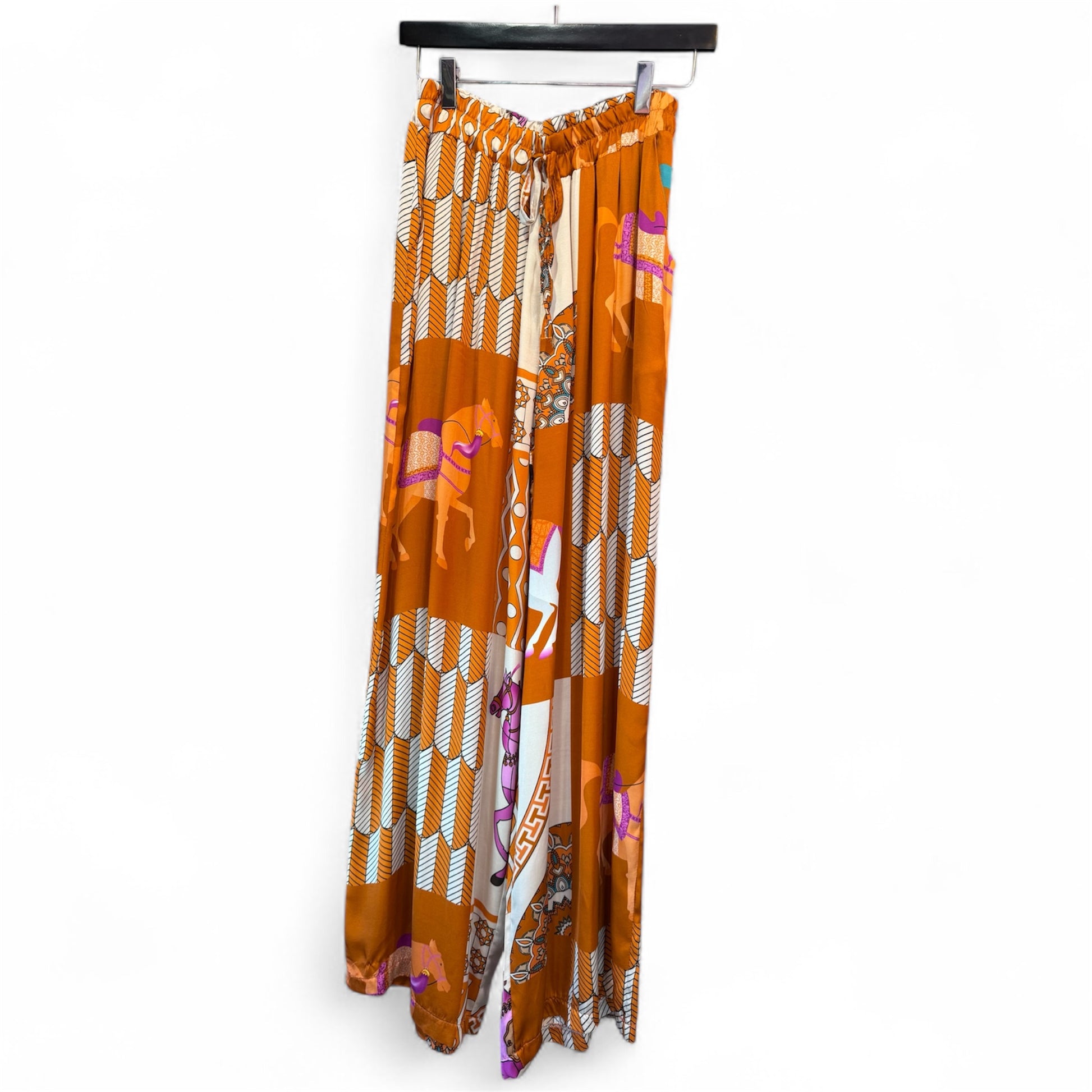 Stunning long-sleeve tunic and wide-leg trouser set with gorgeous ‘Hermes’ style horse print. Perfect as a two piece, or layered with knitwear. In gorgeous satin fabric.