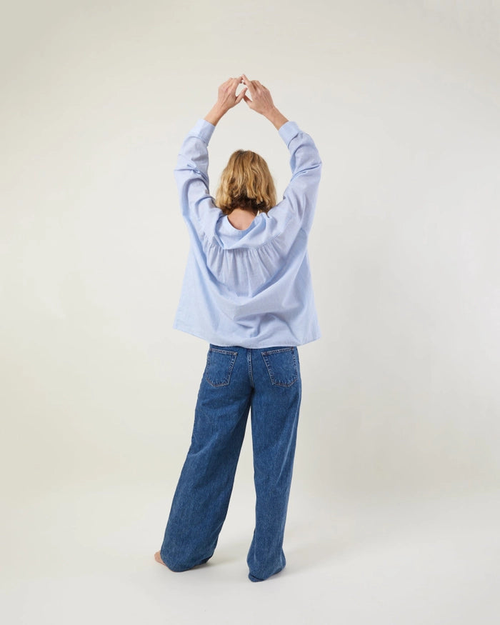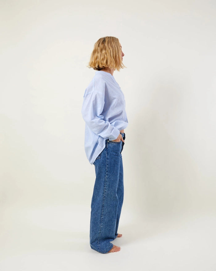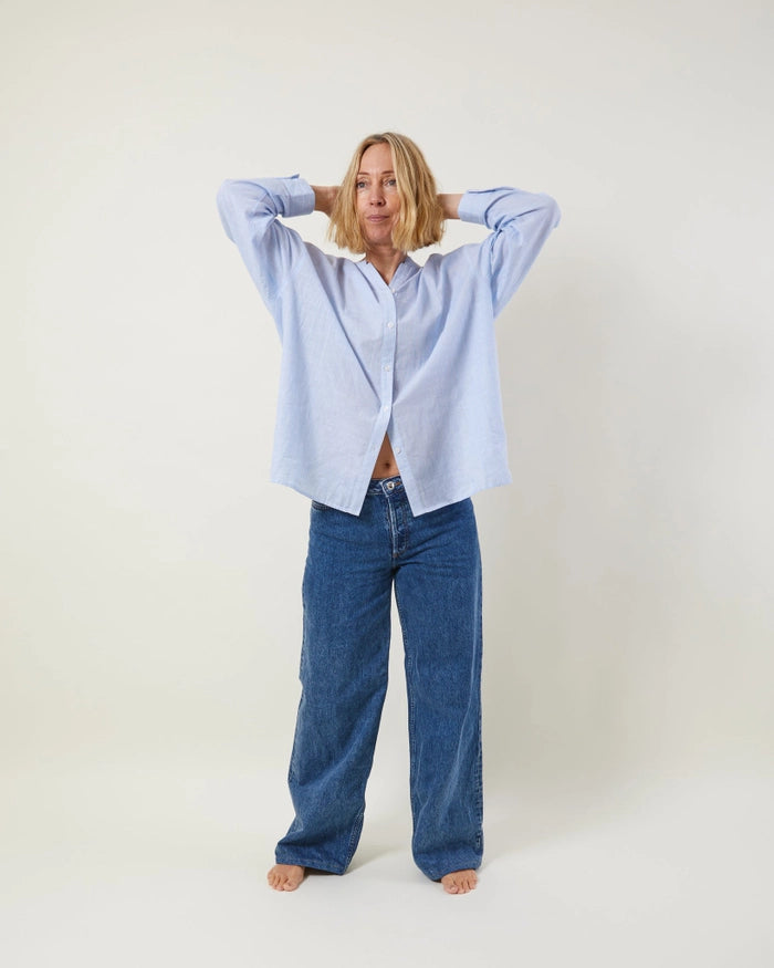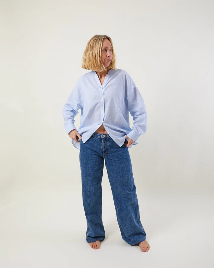 Crafted from 100% cotton, the Heidi Shirt in Blue Stripe offers a lightweight, comfortable fit. The grandad collar adds a touch of sophistication to this versatile piece, while the thin pale blue stripe adds a subtle pop of colour. Perfect for any occasion, this shirt is a must-have for your wardrobe.