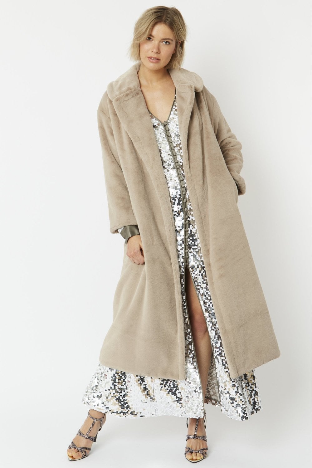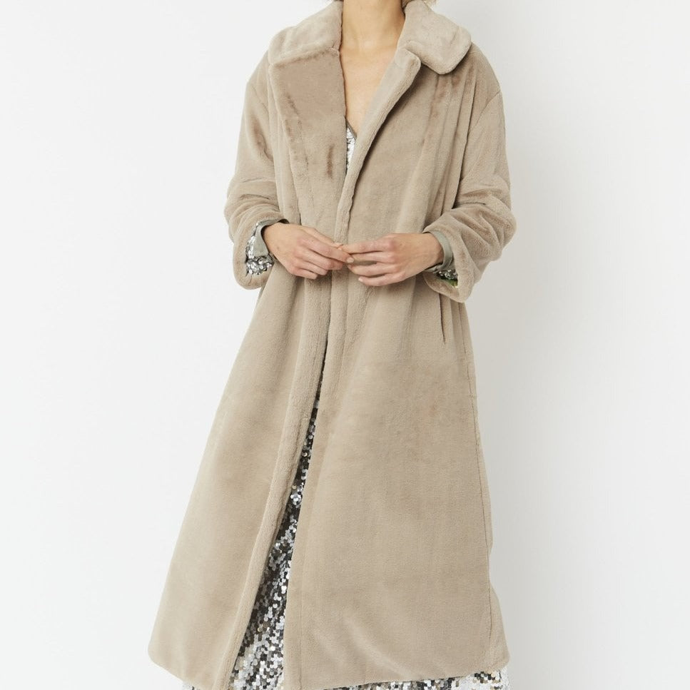 Shop this faux fur vintage-inspired coat a luxe piece that's perfect for transitioning from day to night. We love the oversized shaping, long length and of course the feeling of total comfort and luxury.This coat features full satin lining and pockets.