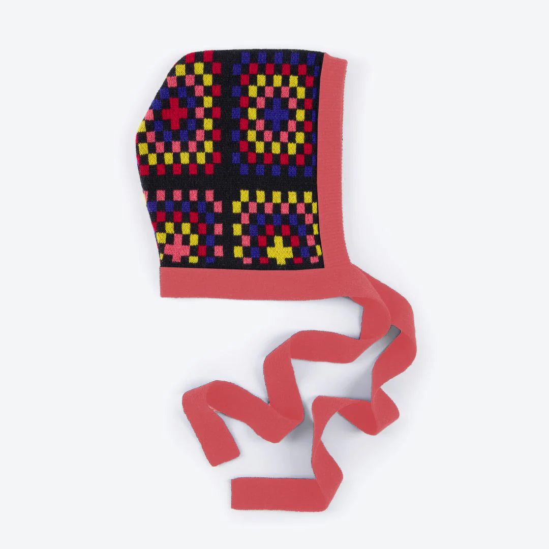 Wrap up in retro style with the Granny Squares Wool Bonnet Hat. Its crochet-inspired checkerboard of bright reds, yellows, pinks, and blues stands out against a black base for a bold, nostalgic look.
