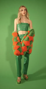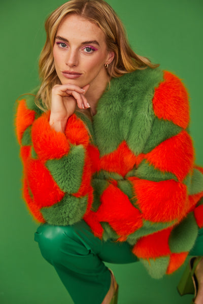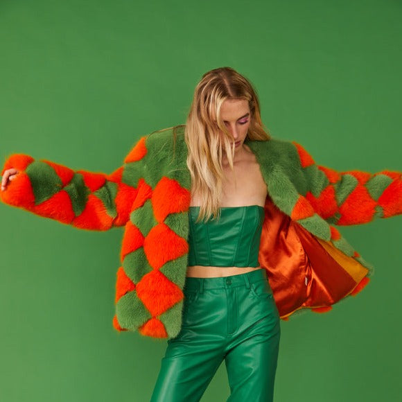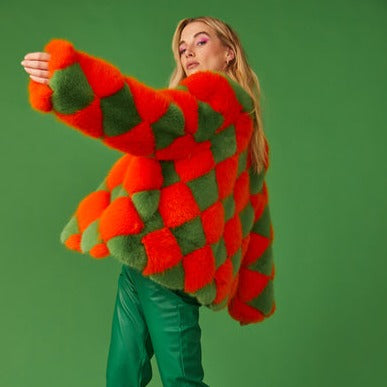 Our orange and green diamond check jacket made from the finest faux fur is a real statement piece. Beautiful and bold, this sumptuously soft coat will keep you warm and in style throughout the cold winter months.