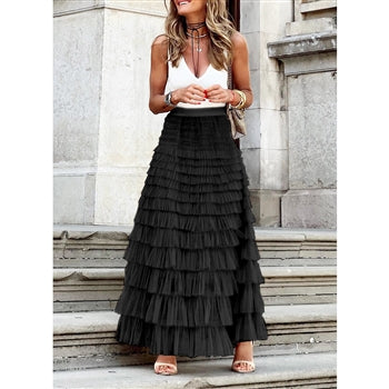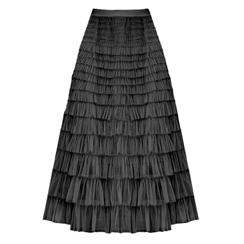 Maxi ruffle tiered skirt in black featuring an elasticated waistband. |
