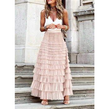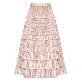 Maxi ruffle tiered skirt in dusk pink featuring an elasticated waistband.