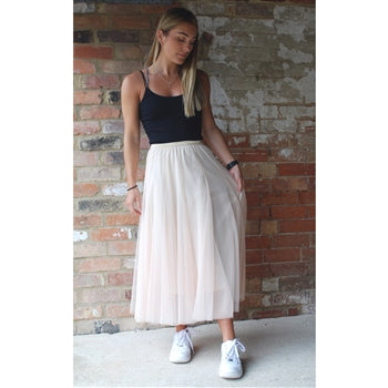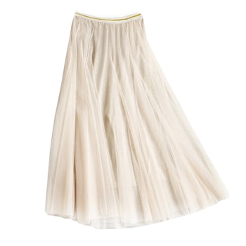 Tulle layer skirt in cream featuring a flattering dart detail and an elasticated waistband with metallic gold stripe. |