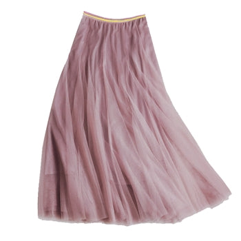 Tulle layer skirt in mauve featuring a flattering dart detail and an elasticated waistband with metallic gold stripe.