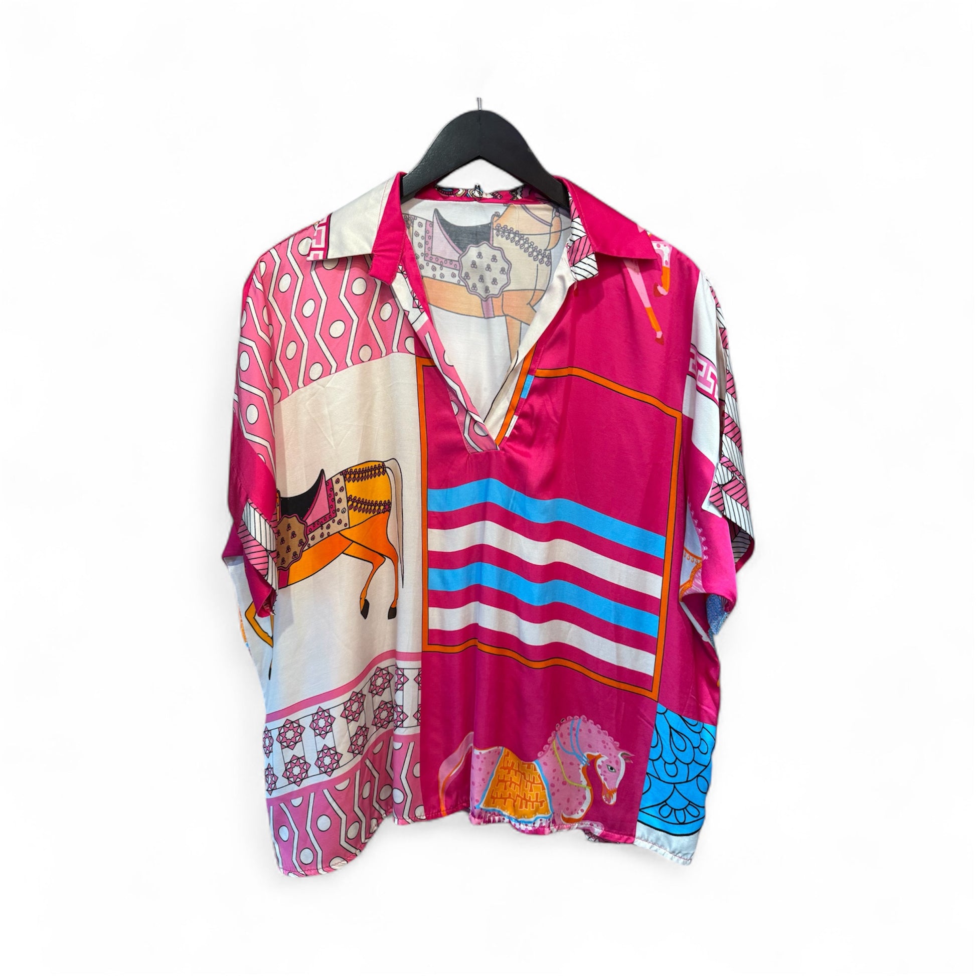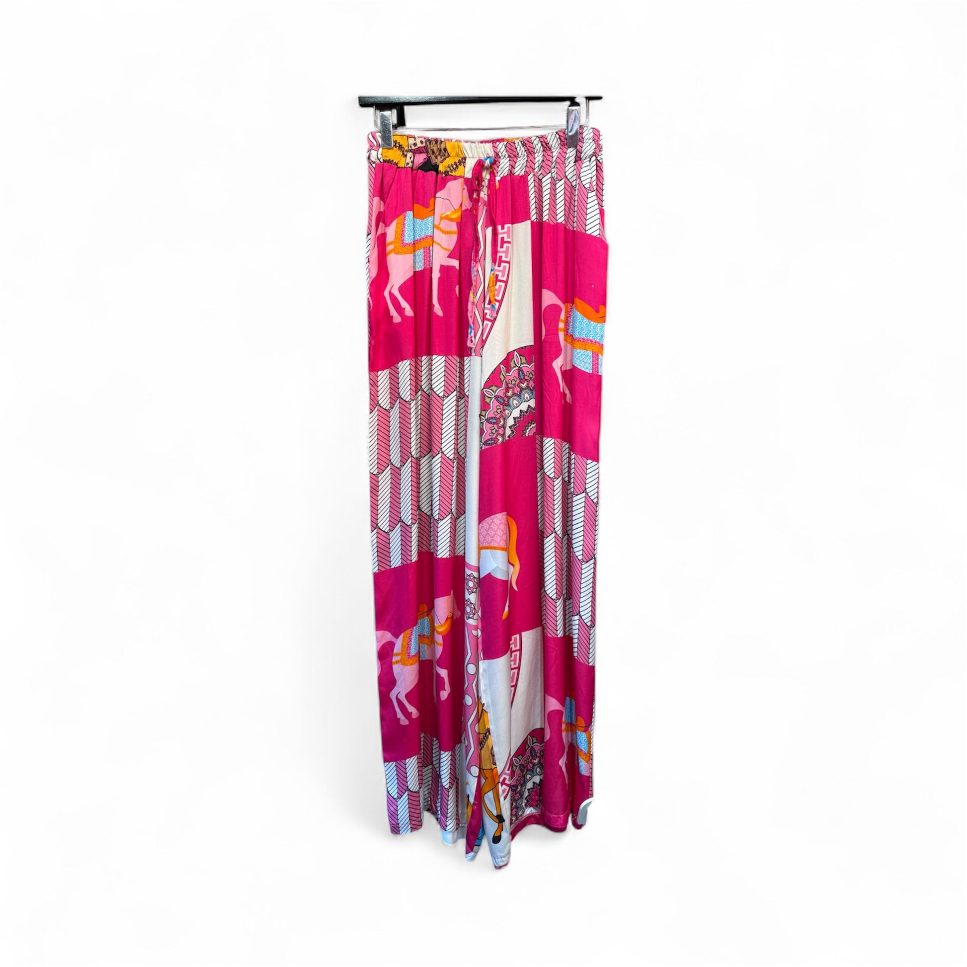 Very comfortable and flattering bright pink tunic and trousers co- ord set. Featuring a stunning ‘Hermes’ style horse print.