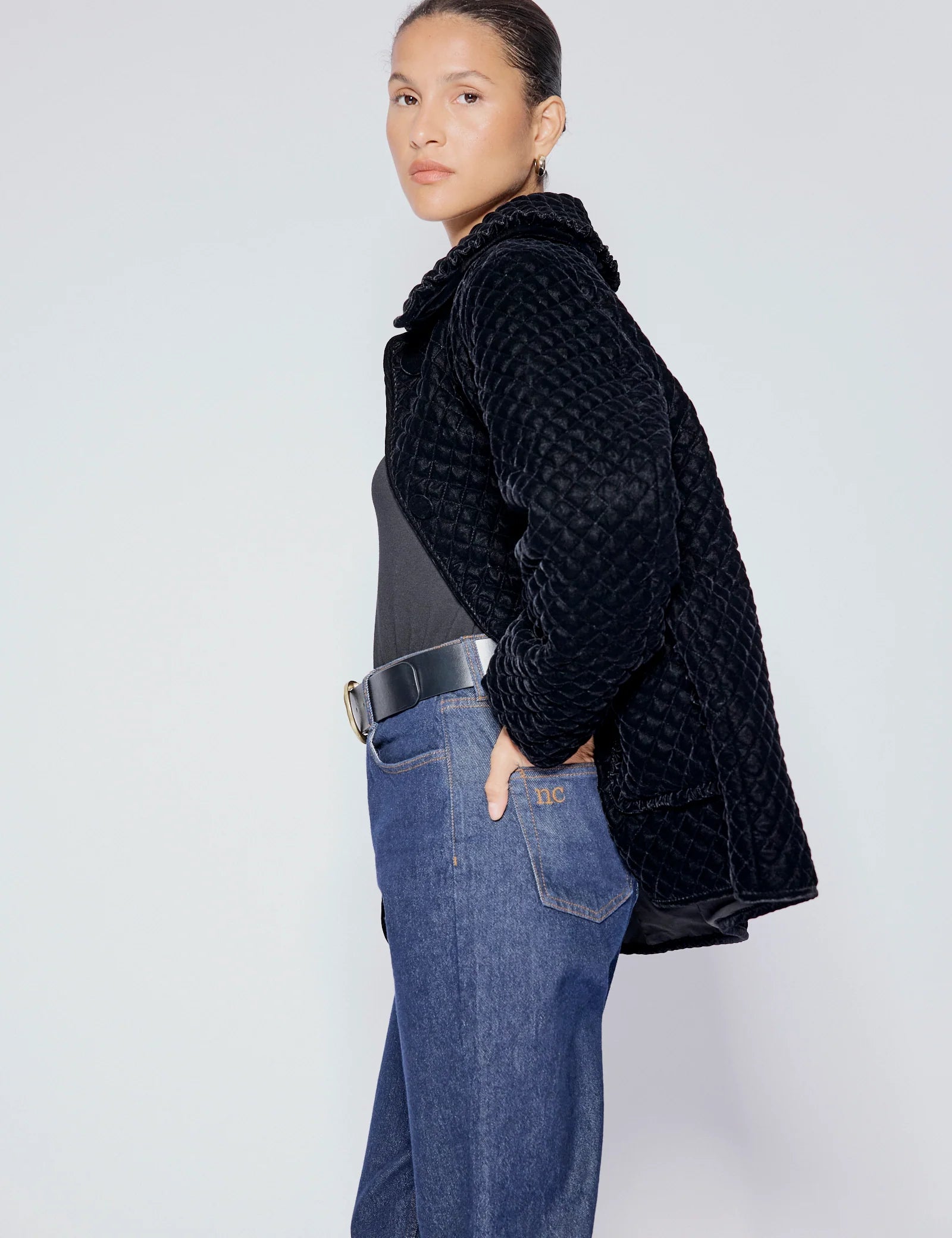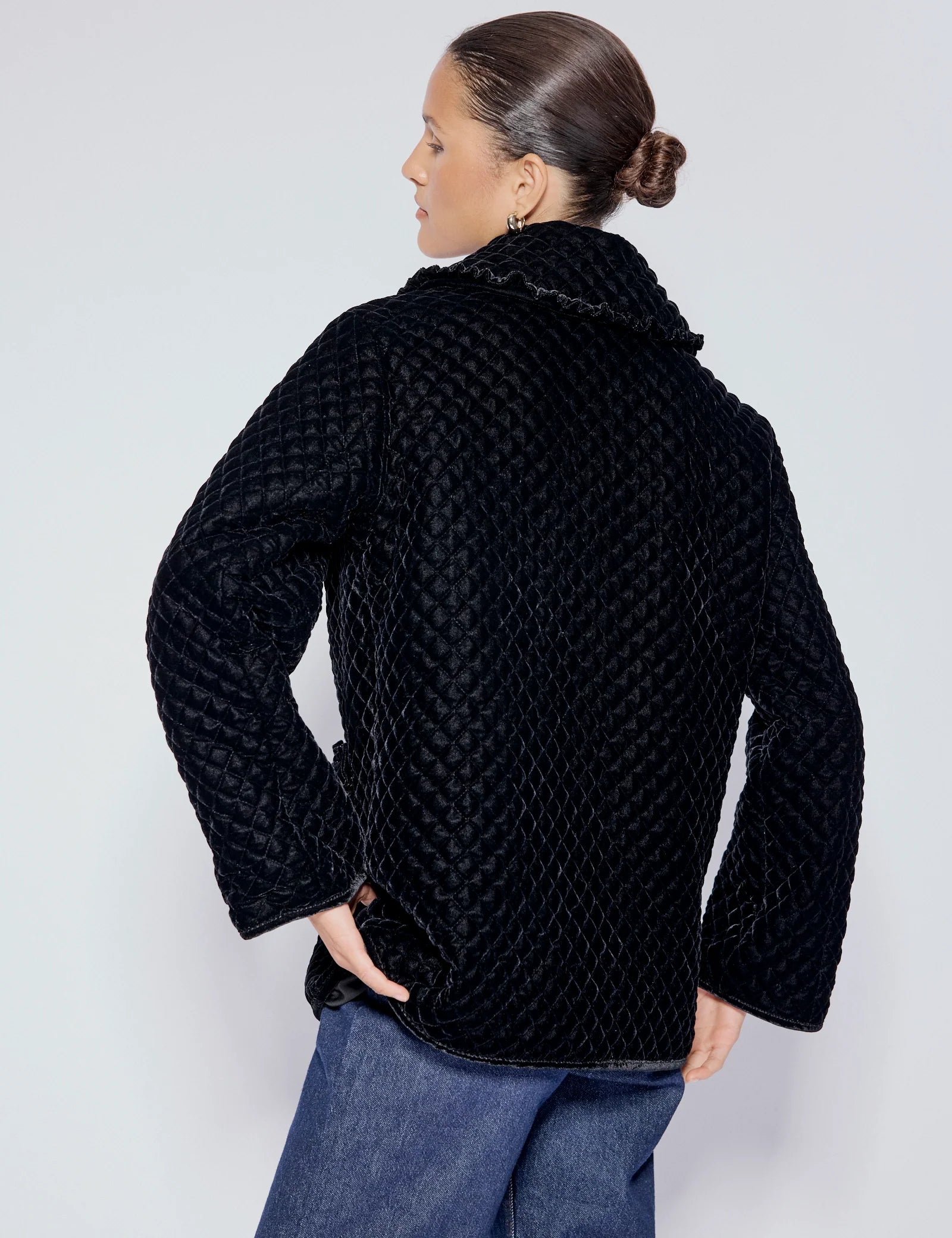In soft velvet, this black quilted jacket features a ruffle-trimmed collar, long sleeves and button front. It's finished with patch pockets and a relaxed fit.