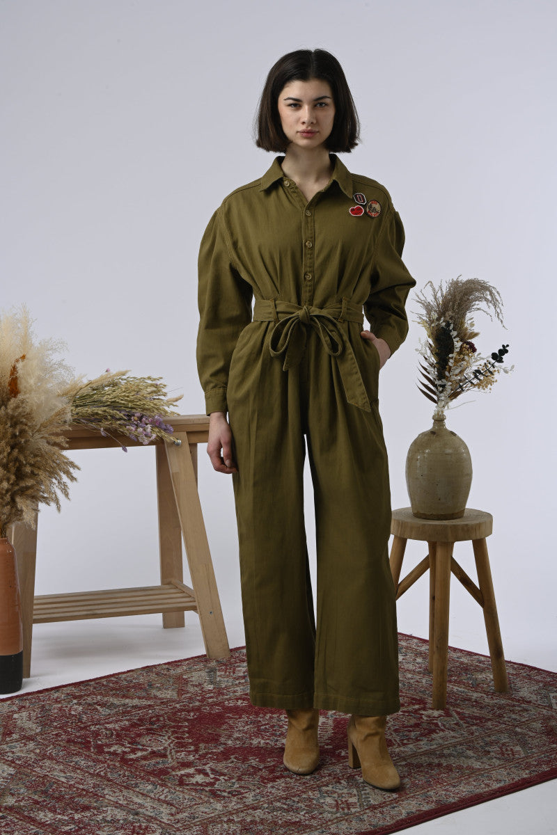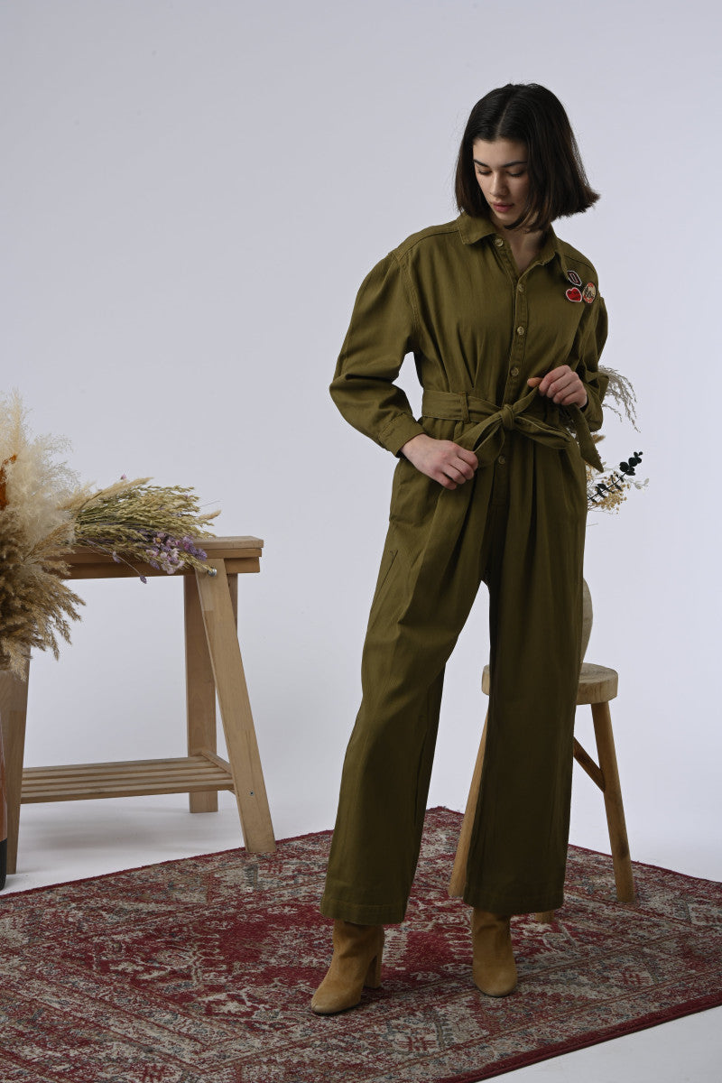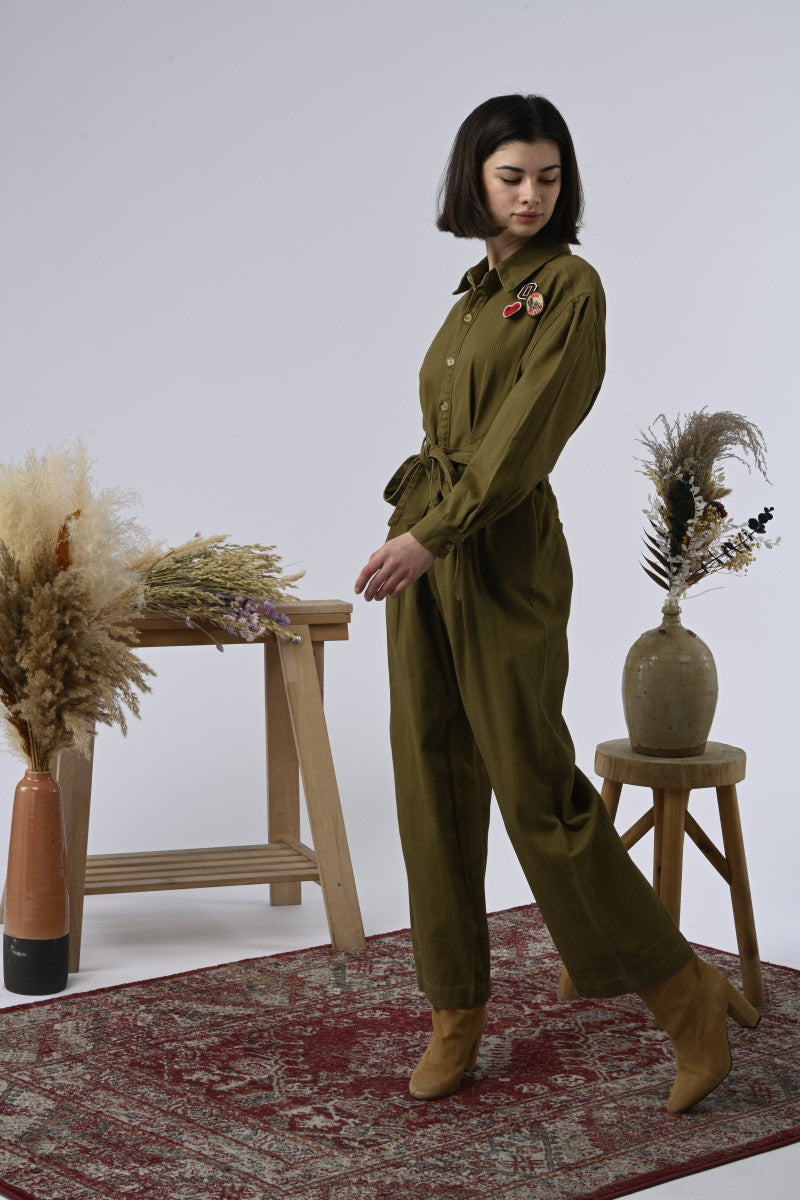 Starr jumpsuit in pure cotton with a feminine utilitarian look. Straight cut, belted waist, contrasting embroidery, and button placket for a look that's both practical and stylish. The Starr jumpsuit revisits the utilitarian spirit in a resolutely feminine and modern version. Crafted from pure cotton, it offers a comfortable and lightweight feel, ideal for everyday wear. Its straight cut and belted waist elegantly structure the silhouette, creating a look that's both practical and stylish. Contrasting embroidery on the pockets or collar adds a touch of character and originality, transforming a utilitarian garment into a fashion statement. The button placket on the front reinforces its authentic look while ensuring easy dressing. The Starr jumpsuit is a unique piece that simplifies your routine. Wear it with sneakers for a casual, urban look, or with ankle boots for a more assertive style. It lends itself to many occasions, from the weekend to a creative workday. It's the essential that combines the comfort of a relaxed cut and the elegance of careful details.