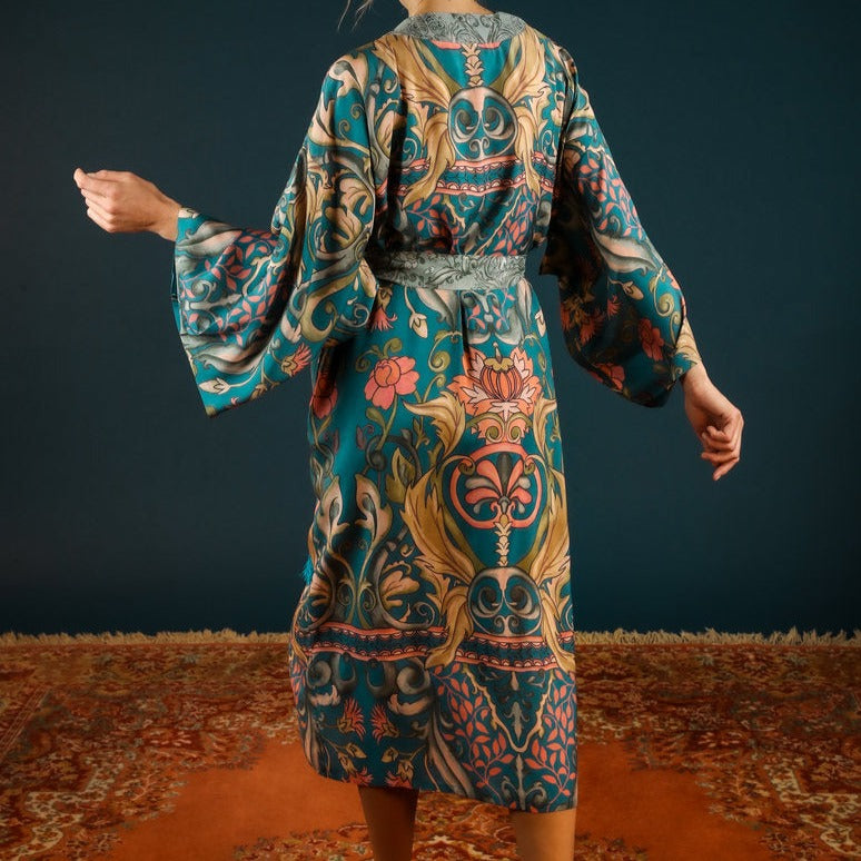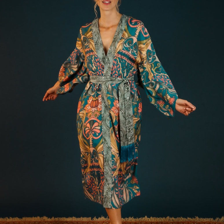 A glorious modal and viscose blend, this Decorative Damask Kimono Gown has a baroque flavour mixed with our iconic and contemporary Powder palette. The perfect piece for draping over any outfit to add style and sophistication - you will be sure to turn heads wherever you go! Equally suited to wrap around your sleepwear - you will never want to take it off! Comes with exclusive limited-edition packaging which is fully recyclable.