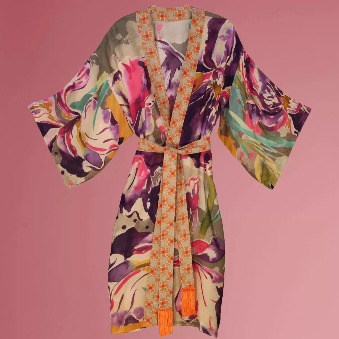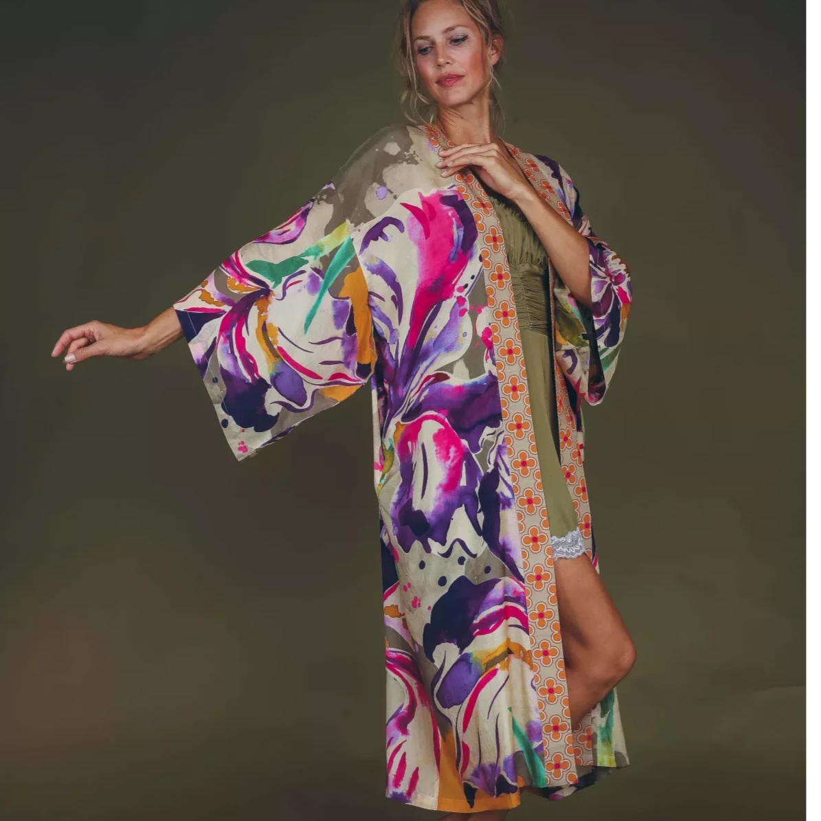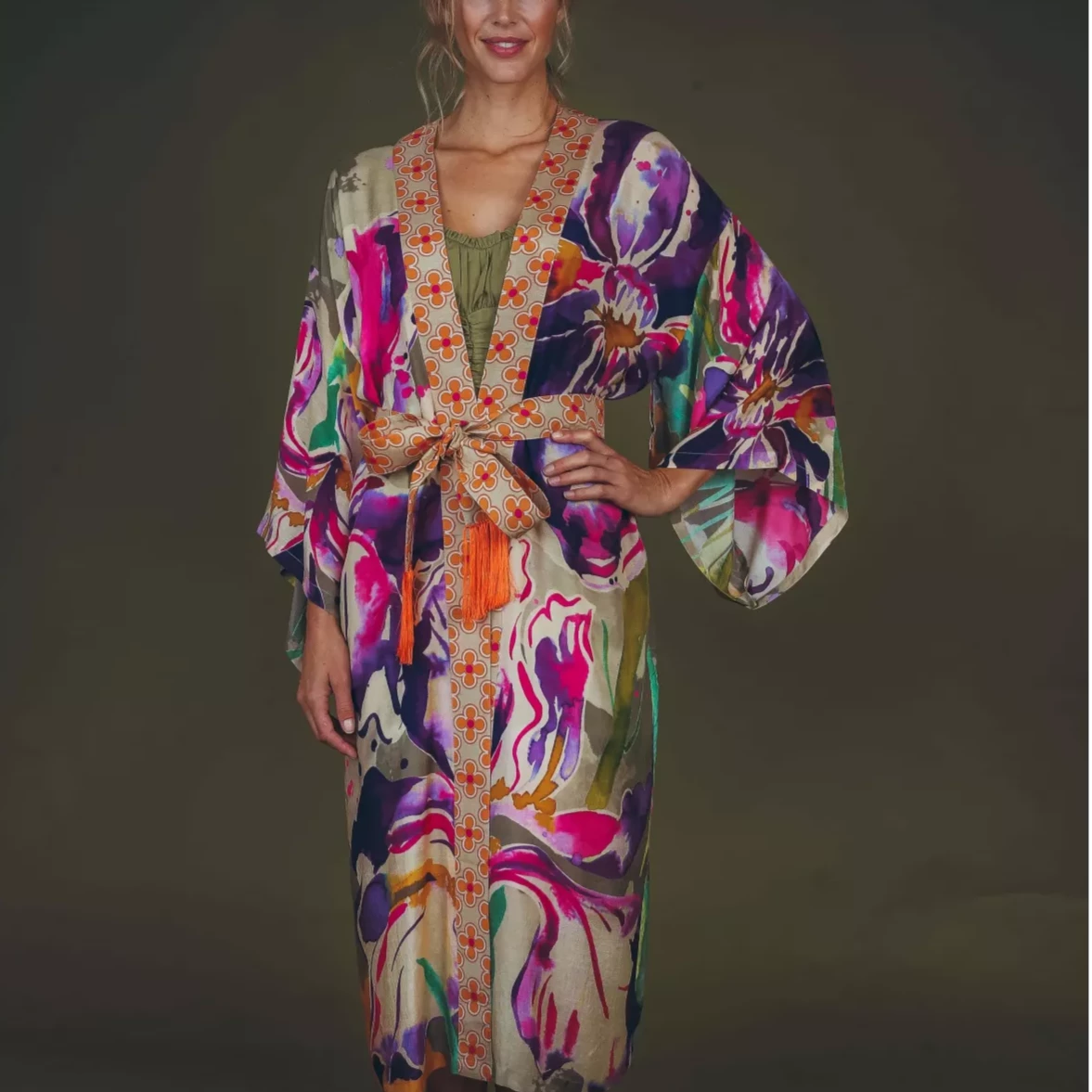 Elegant Sage Iris Kimono Gown from Powder. A glorious modal and viscose blend, this Sage Iris Kimono Gown is the perfect piece for draping over any outfit to add style and sophistication - you will be sure to turn heads wherever you go!