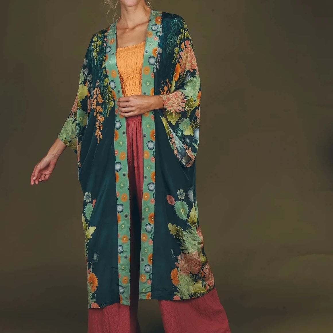 Powder Trailing Wisteria Kimono Gown, beautiful classic long kimono with matching trim and belt. The stunning wisteria print is in soft shades of green and ochre on a soft blue background. The tie belt has a silk fringe to finish it. Wear as lounge wear at home, a holiday cover up or layered over trousers as a summer coat for endless versatility.