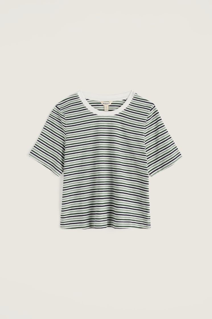 We've given the Copseland T-shirt a boxy fit and comfortable ribbed neckline. Made from soft organic cotton jersey in beautiful Cornish colours, it's a wardrobe staple you'll find ways to style every day. Designed with a slightly shorter length to look great with high waisted skirts, jeans and trousers.