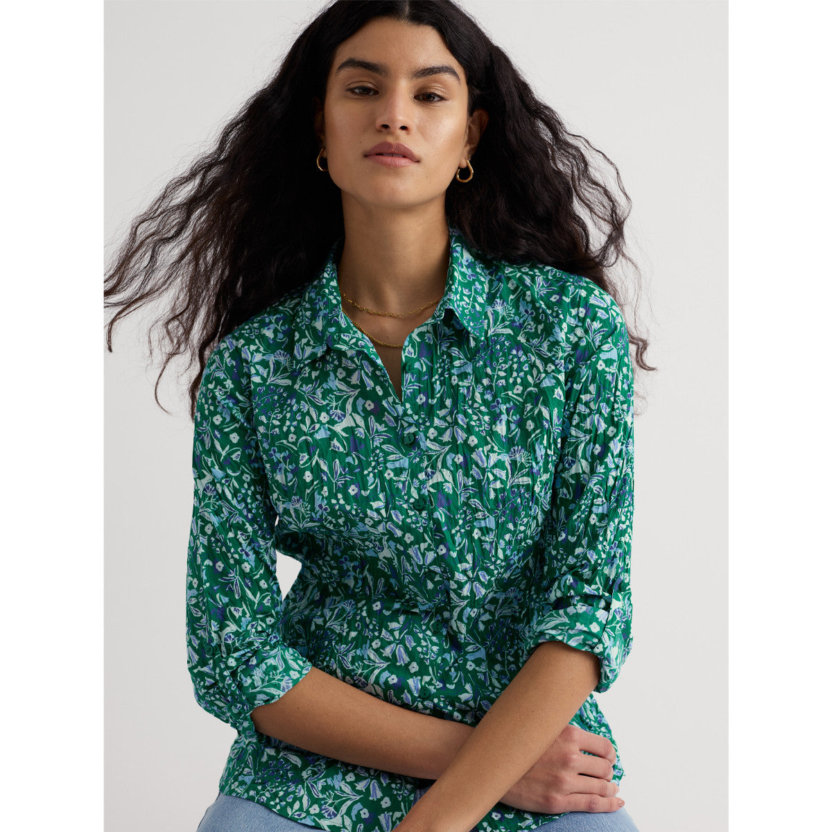 Our Larissa Shirt is a year-round favourite. Made from the softest organic cotton with a casual crinkled appearance, the beauty of this shirt is that it doesn’t need ironing – just wash and twist to keep the crinkle. This semi-fitted style is easy-to-style and comfortable, with long sleeves and button loops so you can roll up the cuffs to change your look. Each season, it showcases some of our most-loved prints, created by our talented textile designers.