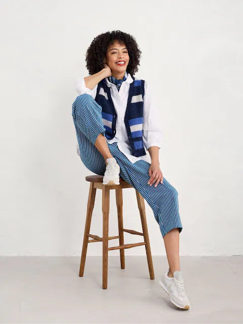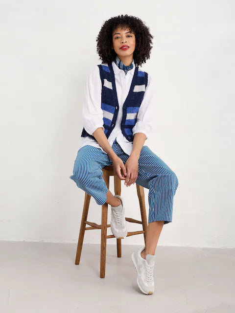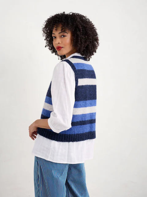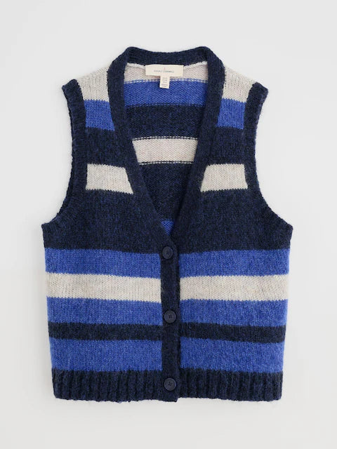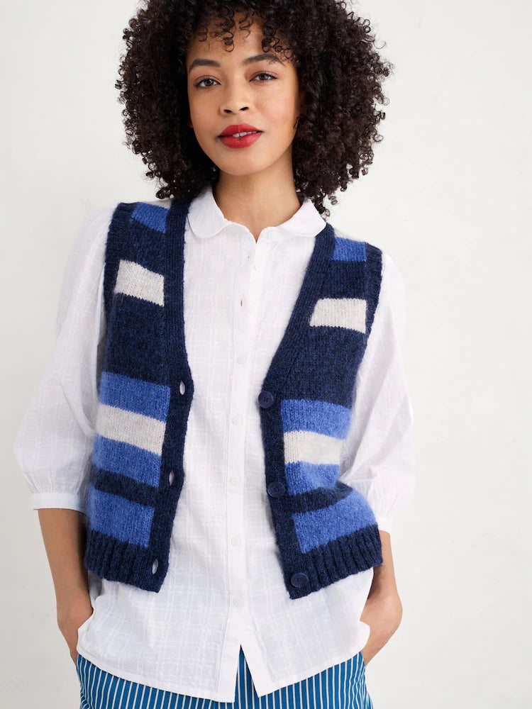 For elevated layering, add our striped Painter Vest to your outfit. The button-down vest is knitted from a soft blend that includes luxuriously fluffy mohair. Its deep V-neck curves gently into the three-button placket in a contrasting stitch, while ribbed trims at the hem and armholes bring a traditional finish. With its neat fitted shape and invitingly warm knit, this is a refined way to keep out the chill.