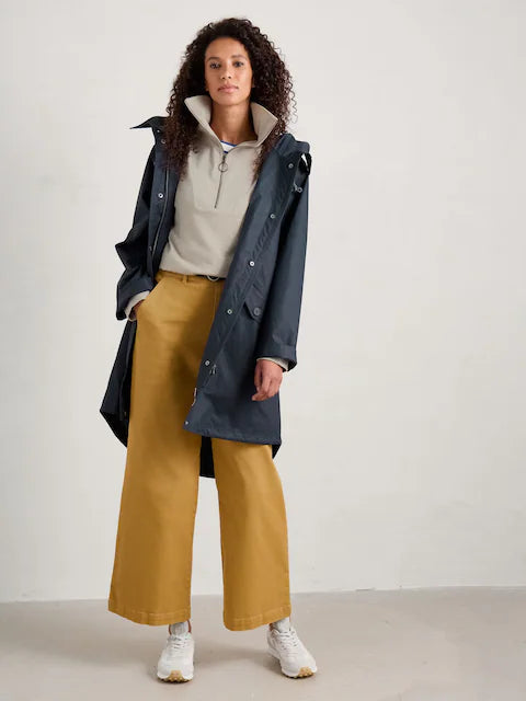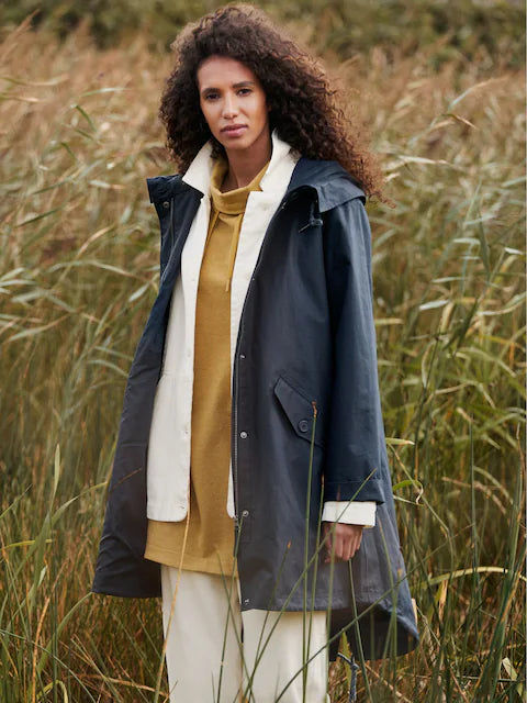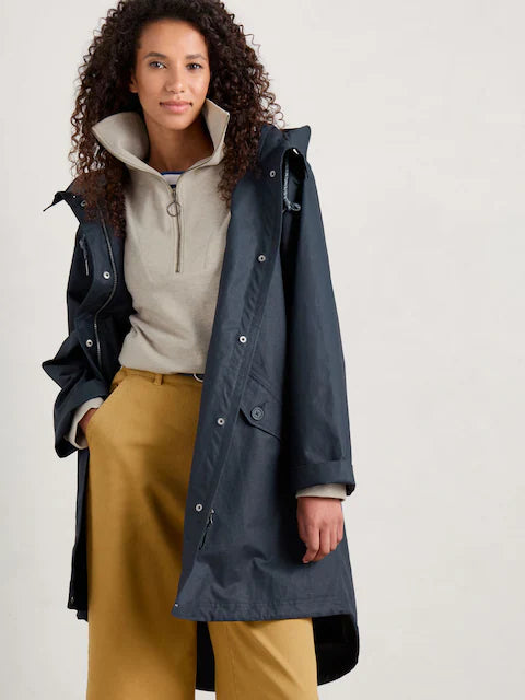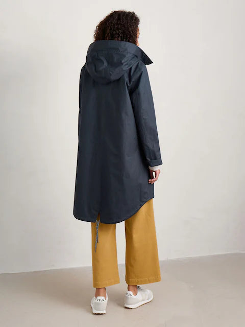 Our Seafaring Coat has a simple, A-line parka shape with fishtail hem, handy buttoned pockets and an internal phone pocket too. Perfect for days outdoors, whether you're battling the elements by the coast or navigating city streets. Made from linen cotton Tin Cloth® with a cotton lining on the upper body and polyester lining on the arms and lower body.
