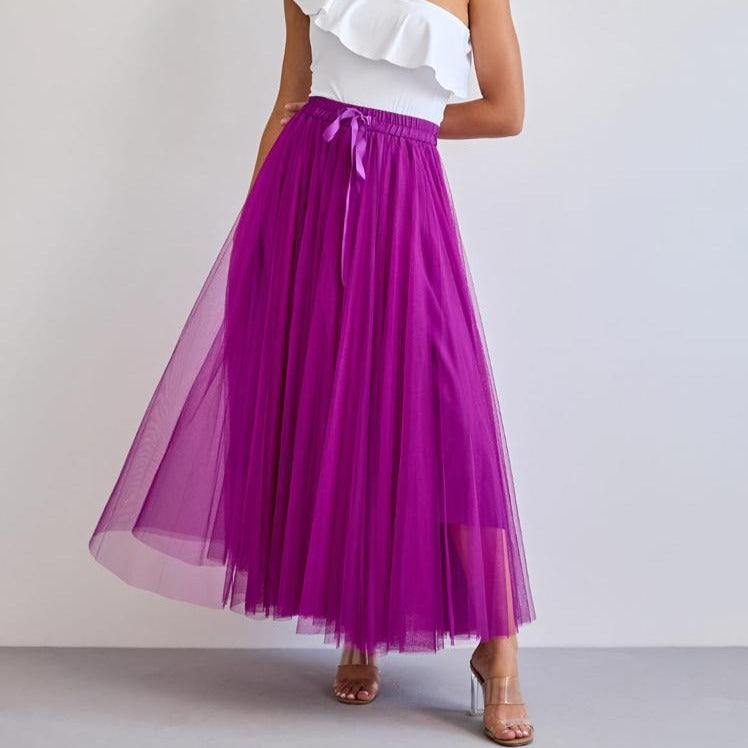 Long tulle skirt , half lining, and ribbon tie waist band.